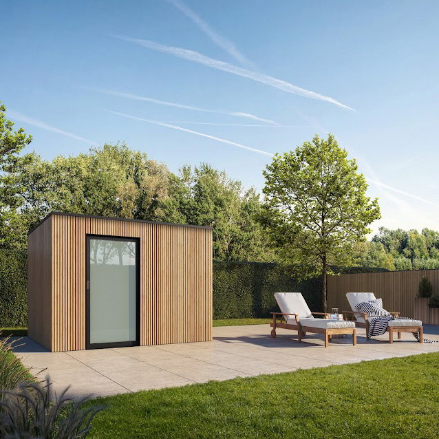 Die Box Thermowood ist eine elegante Gartenhauskonstruktion mit Holz-Verkleidung in einem modernen Rillenprofil, erhältlich Kiefer Thermowood.