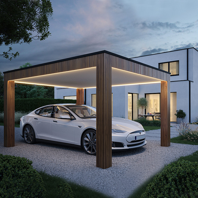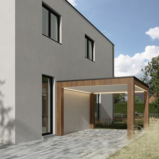 Verschiedene Komponenten sind mit Aluminium veredelt, um einen raffinierten, schlichten Look zu erzielen. Leibungen, Dachrand, Fenster und Schiebetür sind in Schwarz RAL9004 oder Weiß RAL9010 erhältlich. Andere Farben sind auf Anfrage erhältlich.